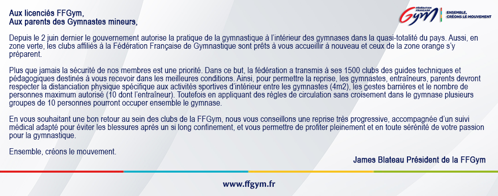 Tandis que la France est entrée dans la phase 2 du déconfinement, la FFGym lance un plan ambitieux avec un million d’€uros dédié au soutien et à la relance de ses clubs.