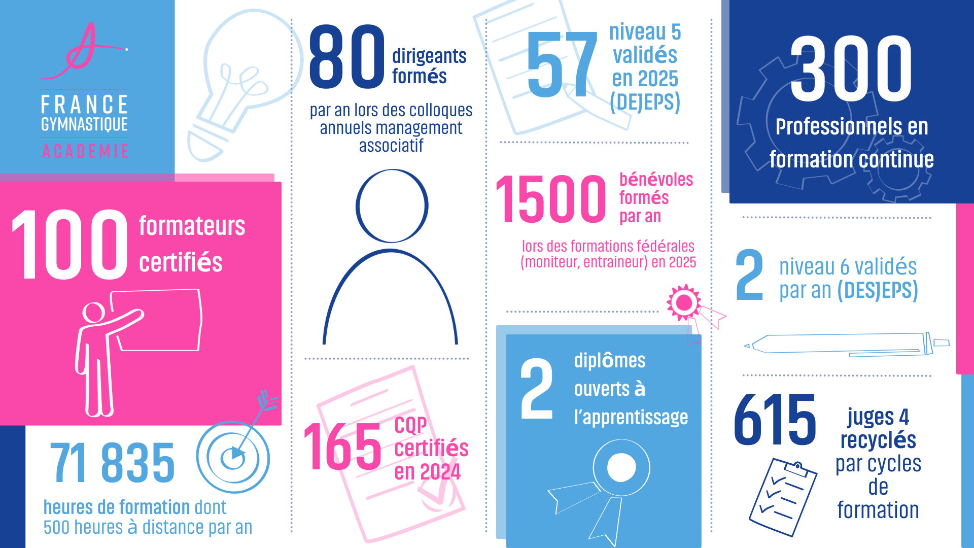 Aujourd’hui, l’Académie développe des formations de qualité à tous les niveaux d’intervention, en s’appuyant à la fois sur sa structure interne et sur la collaboration avec ses différents partenaires, qu’ils soient services déconcentrés de la Fédération ou organismes privés.