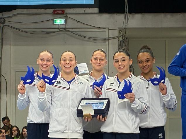 Chez les seniors, l’équipe composée d’Elena Colas, Maïana Prat, Célia Serber, Ming Gherardi Van Eijken et Lola Chassat décroche l’argent avec un total de 160,798 points, juste derrière les États-Unis.